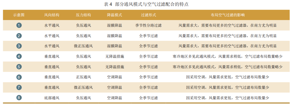 1)从送风结构上来划分,大体分为水平通风、垂直通风、底部通风的通风模式;2)从空气压力结构上来划分,大体分为正压、微正压、负压的通风模式;3)从降温特点上来划分,大体分为湿膜降温、空调降温的通风模式;4)从过滤的形式来划分,大体分为全季节过滤、季节性分路通风的通风模式。