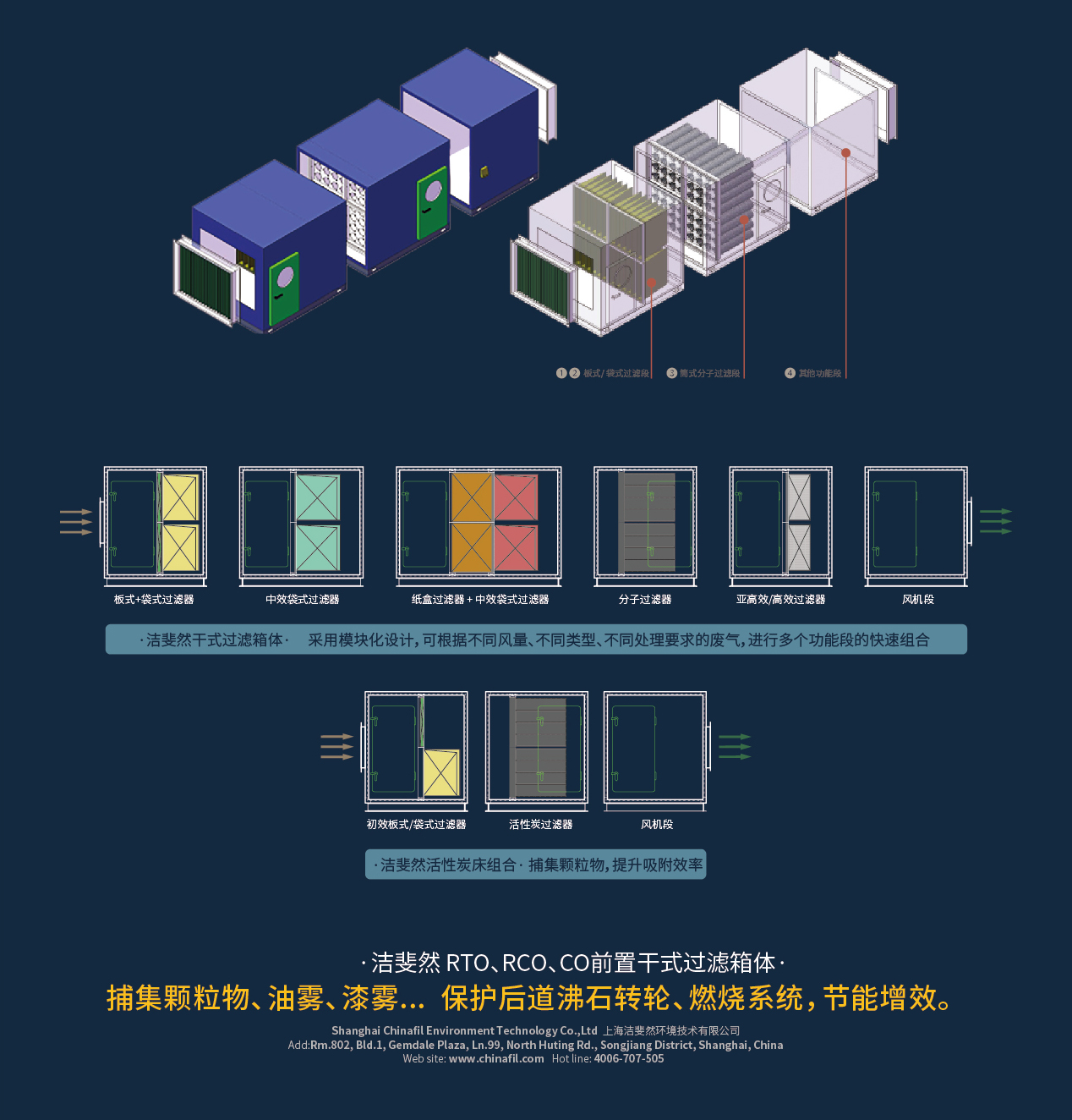 今年会干式过滤箱体适配一级或多级过滤器,对颗粒物、油雾、漆雾等物质进行拦截捕集,❶,提高废气处理效率,❷,为沸石转轮、燃烧系统提供保护,减少转轮、蓄热燃烧设备 堵塞、结垢的风险。小小的投入,一“箱”两悦,增效、节能、降本,延长RTO、RCO、CO设备使用寿命。