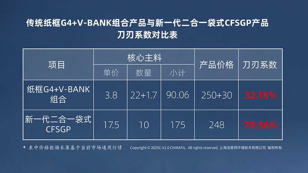 当前主流的G4纸框初效+F9玻纤V-Bank组合存在显著成本缺陷:初始装机成本280元(初效30元+V-Bank250元),加上在过滤器寿命周期内需更换2-3次初效,综合成本高达390-475元。其中纸框初效每次更换涉及25-30元隐性成本(含物流、人工、废料处理),如果按时更换会存在阻力升高导致能耗增加、主过滤器寿命缩短等潜在风险。