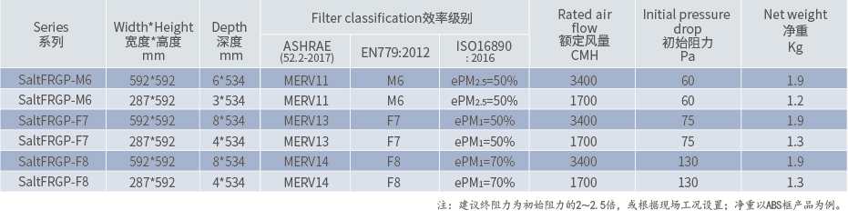 耐盐腐初效过滤器——SaltFRMP-G4级是一款性能好的海洋产业通风系统预过滤器。滤材为聚酯纤维,滤料和金属网紧密粘合,增强了滤料褶层强度,减弱褶层抖动,运行阻力低,容尘量大;废旧的过滤器可做焚烧环保处理。作为专为远洋运输、钻井平台和海港通风系统而设计的预过滤器,具备优异的过滤性能和耐盐腐性能,用户的通风系统可在SaltFRMP保护下获得更好的运行性能提升。