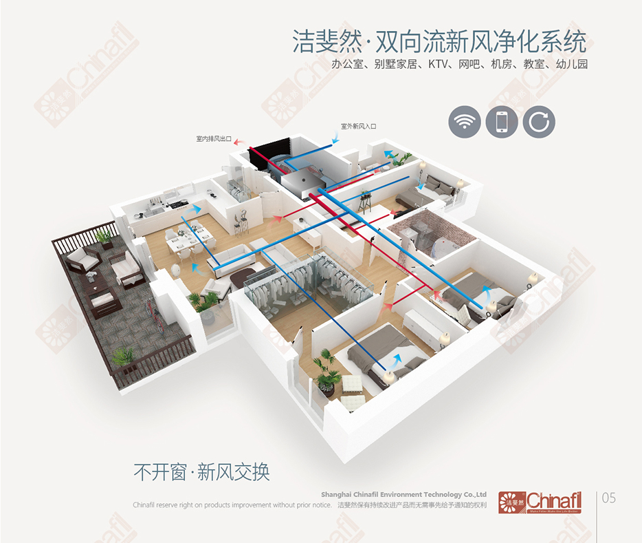 新风系统是一种新的宜居文化,在德国、西班牙、美国等西方国家,住宅新风系统已经与建筑物溶为一体,成为建筑标准的一部分。当出现污染、雨雪大风等极端天气无法开窗时,通过新风机内L6/9级防疫级的空气过滤、紫外杀菌、除臭等功能给室内带来充足的洁净空气,同时阻隔室外细菌、流感病毒、COVID-19(新冠病毒)的侵害。甚至,在长期差旅时,可通过远程监控管理呵护衣物和家私,避免空置期间滋生细菌发霉,真正做到不开窗新风交换。